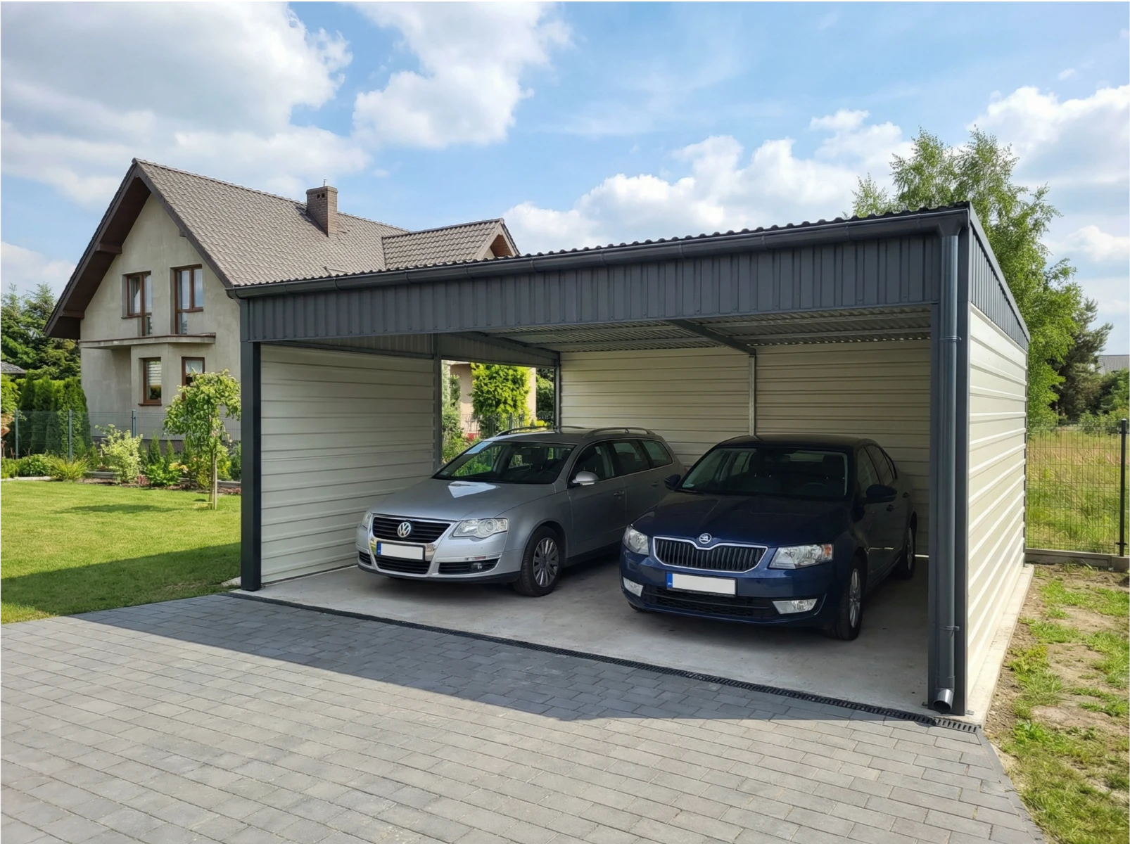 Stalowy ciemnoszary carport z zadaszeniem i przyległą zamkniętą częścią użytkową
