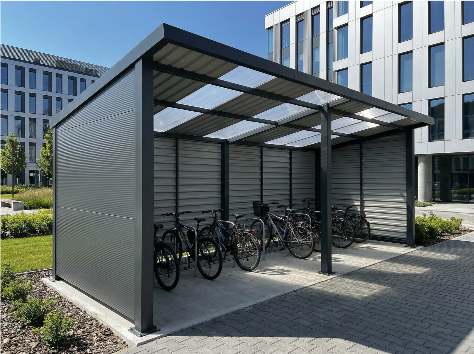Metalowa wiata rowerowa z ciemną konstrukcją stalową i stojakami na rowery nad rzeką